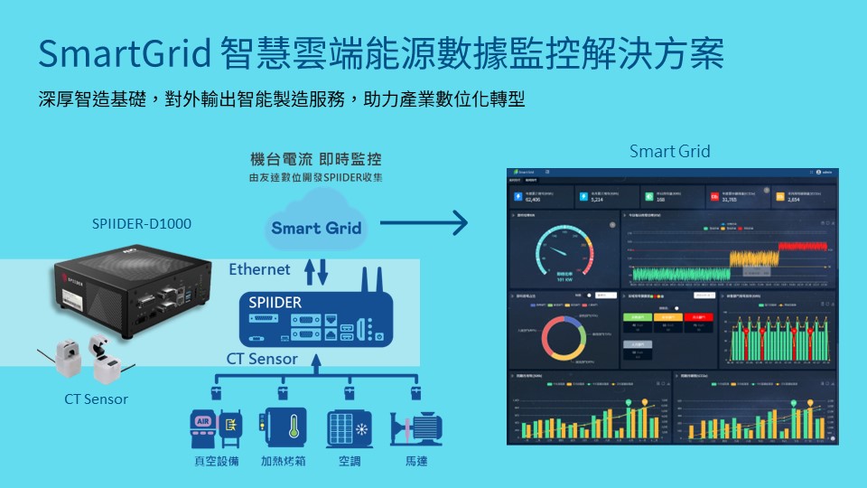 Smart Grid 是一款具備能源數據解析能力的智慧能源管理平台。透過物連網技術,應用設備元件(如電流感應器,SPIIDER)進行監控工廠耗能設備,蒐集設備能源使用數據,並將其資訊透過數據解析拆解,資訊融合與搭配高可讀性圖表,讓能源管理者精準的實現智能化管理,能源改善建議方便,人人都可以輕易上手使用。