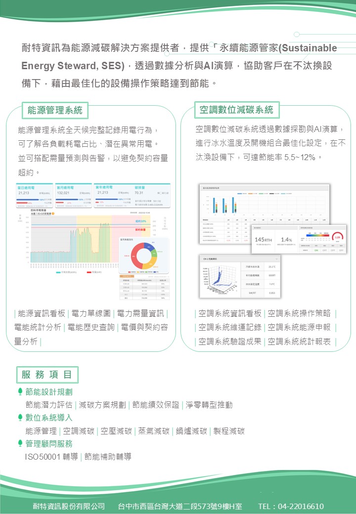 永續能源管家 (Sustainable Energy Steward, 以下簡稱SES)為一套幫助企業審視建築用電,透過能耗評估,挖掘出可實行節能的方案,從企業內部至全球淨零碳排產生正效益。 SES提供能源申報、空調節能、電能管理、碳盤查等多元模組,協助企業達到永續經營目標。