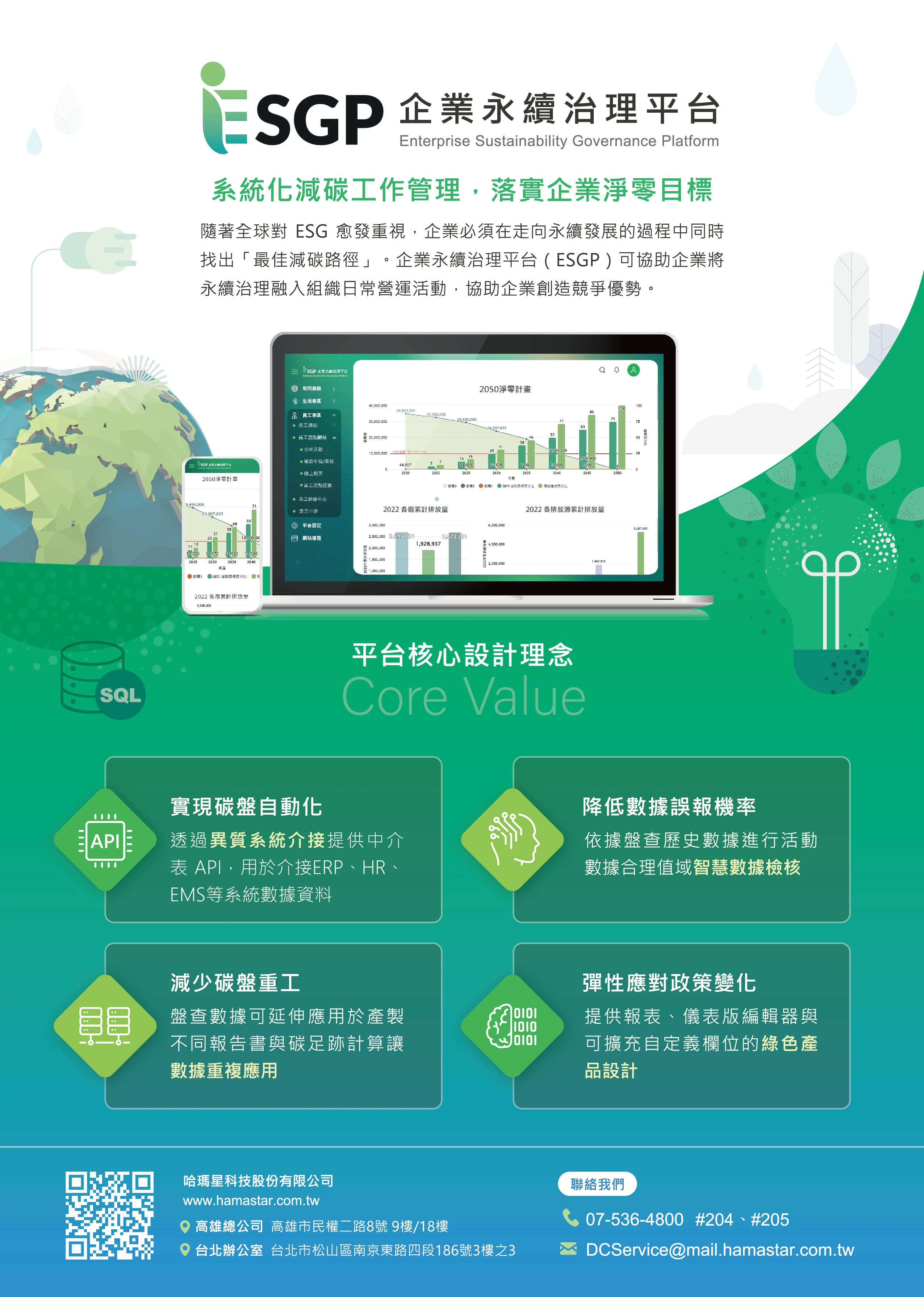 ESGP(企業永續治理平台)是由哈瑪星科技公司開發的一款專注於支持企業實現可持續發展的數位工具,特別針對碳排放管理。該平台提供全面的功能,包括碳盤查、報告產製及減碳管理,並符合國際標準如ISO 14064-1和GHG Protocol,以確保數據的準確性和合規性。使用者可以依據國際標準進行數據儲存和計算,並搭配AI生成跟檢核,符合GRI、TCFD、SASB等國際準則的永續報告書。ESGP還具備數據可視化功能,幫助企業有效監控碳排放狀況並進行熱點分析,以支持後續的減碳規劃。這款平台不僅簡化了碳管理流程,還促進了企業在數位化與綠色永續上的雙軌轉型。